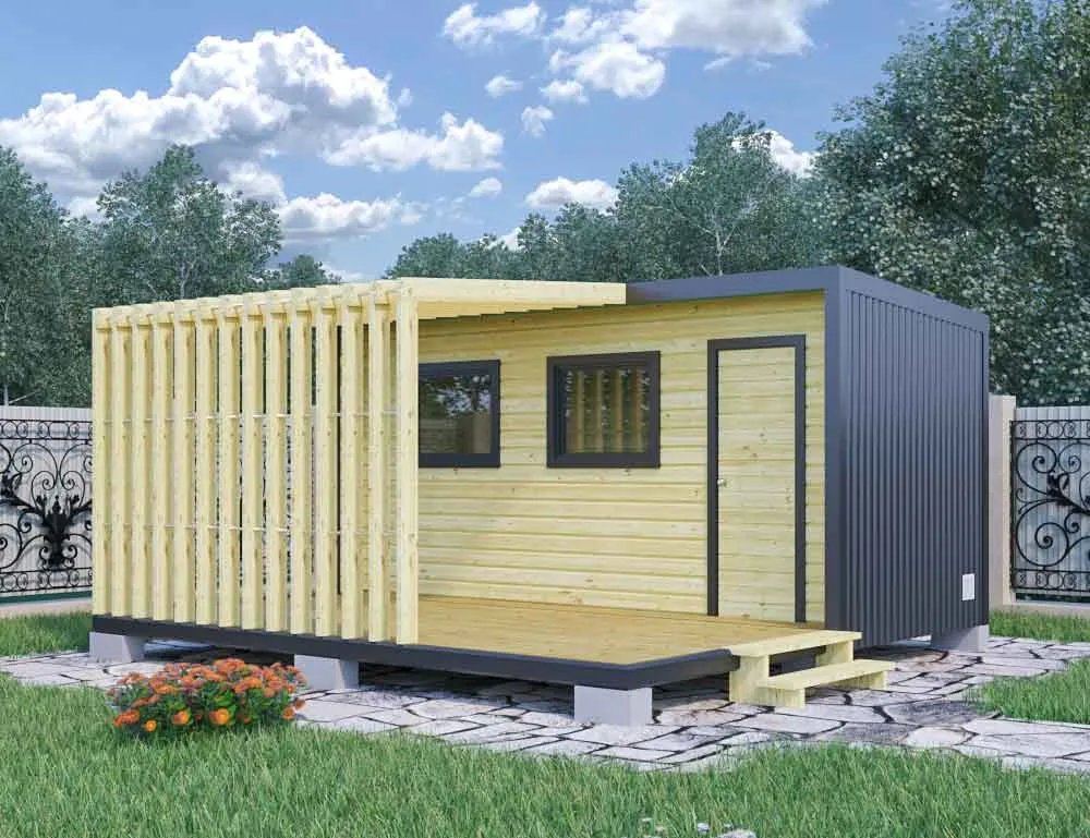 Бытовка для дачи в стиле хай-тек 4,8х3 с верандой4,8х314.4ДВП-Оргалит: